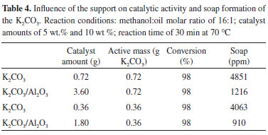 From the results presented in Table 4 it is clear that a reduction in the soap formation occurs with the supported K2CO3 . Based on the results shown in Table 4, a reduction in soap formation was obtained by replacing the unsupported catalyst with the alumina-supported catalyst (77.6% with 5% catalyst and 75% with 10% catalyst). Therefore, the above results indicate that K2CO3/Al2O3 can be used a limited number of times as a catalyst in the transesterification reaction under microwave heating. However, the production of a small amount of soap is unavoidable.,