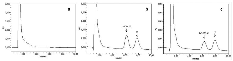 Figure 2. Representative HPLC chromatograms of: (a) blank rat plasma, (b) rat plasma spiked with LaSOM 65 (600 ng mL-1) and IS (5 μg mL-1), (c) 3 h plasma sample from rat dosed with LaSOM 65 at 1 mg kg-1 i.v. and IS