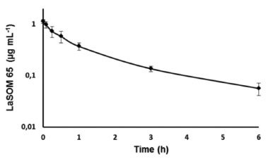 ![]() Figure 3. Mean plasma concentration-time profile of LaSOM 65 after a single i.v bolus dose of 1 mg kg-1 to male Wistar rats. The data points are means, and the error bars are S.D. of three animals