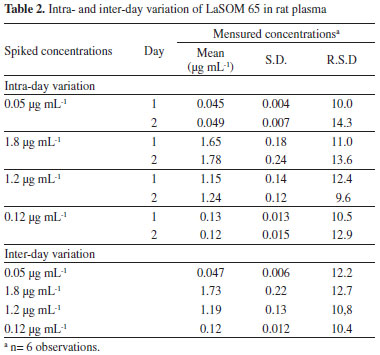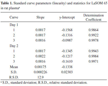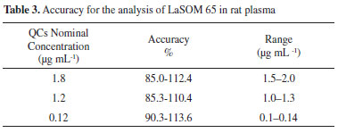 Extraction procedure The plasma samples were cleaned by deproteinization with acenonitrile to achieve high recoveries of both LaSOM 65 and IS. Mean extraction recoveries for the three concentrations levels of the QC samples were 95.84 ± 5.29% and 96.43 ± 9.19% for LaSOM 65 and IS, respectively. Recoveries of the analyte and IS were reproducible throughout the standard curve linearity range. The cleaning method was simple, inexpensive (small volume of organic solvent), and rapid (single step extraction). Method validation The linearity of the method was evaluated by plotting the peak area LaSOM/IS ratio versus concentration to construct the standard curves, which were linear in the concentration range of 0.05 to 2 µg mL-1. Regression analysis results from the calibration standard curves on two successive days are shown in Table 1. The highly significant determination coefficients (r2) obtained (> 0.98) indicate the linearity of the standard analytical curves.
