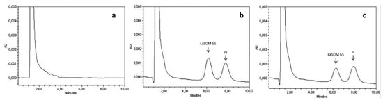 RESULTS AND DISCUSSION Separation conditions Because LaSOM 65 is a lipophilic molecule (LogP 2.935), the use of a hydrophobic stationary phase (e.g. C18-bonded silica columns) for chromatographic purposes allows for the adequate retention of organic non-polar molecules in the column, resulting in good chromatographic separation of the analyte from interferences present in the plasma matrix. Chromatographic separation was achieved using a Nova Pak® C18 column. The column was suitable for separating the drug from the matrix and had adequate resolution and symmetrical peak shapes. With a mobile phase of acetonitrile:water (45:55 ν/ν) at a flow rate of 0.8 mL min-1, it was possible to separate LaSOM 65 from the matrix and IS peaks in less than 10 min under isocratic conditions. The choice of the wavelength of detection was based on the maximum absorption of the LaSOM 65 in the UV spectra (data not shown). The separation and specificity/selectivity of the method are illustrated in Figure 2 by comparing the chromatograms of drug-free plasma samples (blank) (Figure 2a) to those obtained after the analysis of plasma spiked with LaSOM 65 and IS (Figure 2b) and 3.5 h after an i.v dosing of LaSOM 65 in an animal (Figure 2c). The method could separate the analytes from plasma interferences, and LaSOM 65 and nifedipine were also well separated. Plasma components did not interfere with the quantitative determination of the anticancer candidate and IS, indicating that the method is selective.