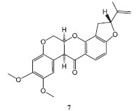 La rotenona (7) es una isoflavona biosintetizada por la ruta de los policétidos (Figura 3). Este metabolito secundario, que se extrae de las raíces de Derris sp. y otras variedades de plantas, se presenta como un potente inhibidor metabólico capaz de bloquear la respiración celular en seres vivos.35 Este compuesto tiene, pues, un interés profiláctico, ya que sirve para la erradicación de especies ícticas indeseables presentes en estanques dedicados a la acuicultura.36 Posee, además, una fuerte acción en el control de invertebrados acuáticos, especialmente de las ninfas de odonatos, las cuales son voraces depredadoras de las larvas de peces y crustáceos.37