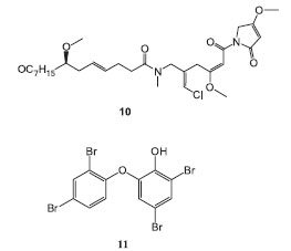 ![]() Figura 6. El fagorrepelente/ fagoestimulador malingamida A (10). Un bactericida marino (11)