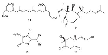 ![]() Figura 8. El fagorrepelente chlorodesmina (13). El antiincrustante pachidictiol A (14). El antiincrustante fimbrolido (15). El fagorrepelente/ molusquicida telfairina (16)