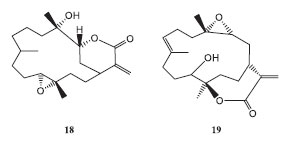 Los diterpenos 11,12-dihidroflexibilido (18) y sinulariolido (19) son compuestos producidos por el coral espagueti Sinularia flexibilis; el primero resultó ser un fagorrepelente del pez mosquito, Gambusia affinis, y el segundo resultó con actividad algicida (Figura 10).56,48