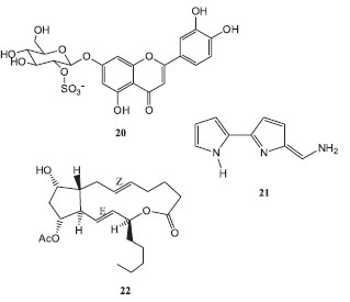 La fanerógama marina Thalassia testudinum fabrica la fitoalexina -fungicida- luteolin-7-O-β-D-glucopiranosil-2-sulfato (20);57 el molusco Tambja abdere produce la tambjamina A (21), un fagorrepelente y, al mismo tiempo, feromona de alarma;48 finalmente, la prostaglandina F-1,15-lactonizada (22) es una hormona que influye en la reproducción y desarrollo de los estados juveniles del opistobranquio Tethys fimbria (Figura 11).58
