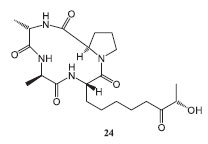 Del ascomiceto Chromocleista sp. se han aislado las dicetopiperazinas.73 Se trata de polipéptidos cíclicos que se han mostrado activos frente a la vibriosis, una de las enfermedades que más pérdidas económicas causan en maricultura.74 Esta enfermedad está causada por varias especies bacterianas pertenecientes al género Vibrio, siendo la especie Vibrio anguillarum la principal responsable del fenómeno en peces, crustáceos y moluscos.75 Otra dicetopiperazina, la mactanamida (24), ha sido aislada del hongo marino Aspergillus sp., y se ha manifestado con actividad fungistática (Figura 13).76