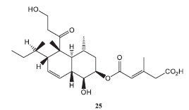 Kobayashi et al., estudiando el hongo imperfecto Trichoderma harzianum, un simbionte asociado a la esponja marina Micale cecilia, han aislado un nuevo policétido, la trichoharzina (25) con propiedades bactericidas (Figura 14).77