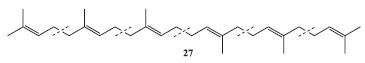 El escualeno (27) es un triterpeno que se encuentra en el hígado de peces elasmobranquios, siendo éste su principal fuente (Figura 16).84 Este componente es un efectivo antioxidante natural, útil en nutracéutica.85 En la actualidad, una variedad de cepas de hongos Thraustochitridos y Labirintulomicetos están siendo objeto de estudio, siendo propuestas como potenciales substitutas de la fuente tradicional de escualeno.86 En este sentido, Chang et al. lograron aislar una nueva cepa de la levadura Pseudozyma sp., que fabrica al escualeno.87 La elevada tasa de producción de este metabolito hace que este organismo marino sea un firme candidato para la producción industrial de "escualeno microbiológico". Por otro lado, se ha observado que la aplicación de la vacuna 763 con pequeñas dosis de escualeno es un remedio eficaz en la prevención de la enfermedad causada por Flavobacterium psychrophilum en los cultivos de ayu Plecoglossus altivelis, uno de los mas importantes peces de agua dulce en Japón.88