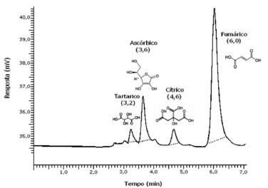 ![]() Figura 1. Separação cromatográfica da solução analítica contendo: 250 mg L-1 dos ácidos tartárico e ascórbico, 500 mg L-1 de ácido cítrico e 50 mg L-1 de ácido fumárico