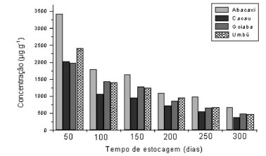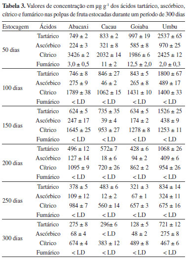 A precisão do método foi avaliada levando em consideração a repetibilidade e a precisão intermediária. Para obtenção da repetibilidade, em um mesmo dia, foram realizadas sete determinações cromatográficas dos teores dos ácidos orgânicos em cada uma das amostras de polpa de frutas fortificadas em três níveis. Os níveis de fortificação são semelhantes aos empregados na obtenção da exatidão. Após dois dias repetiu-se todo o procedimento descrito determinando-se, assim, a precisão intermediária.9-13 Os valores encontrados para ambos os parâmetros encontram-se na Tabela 2 como o desvio padrão relativo (DPR) com resultados em torno de 20%.18,19 Estes resultados são considerados admissíveis de acordo com a literatura e comprovam que a metodologia permanece constante e confiável. Influência do tempo de estocagem na estabilidade dos ácidos orgânicos nas polpas congeladas As taxas de degradação dos ácidos orgânicos, particularmente do ácido ascórbico (vitamina C) em frutas e legumes são afetados por fatores como pH, temperatura, umidade, luminosidade e tempo de armazenamento. Com isso, as perdas da qualidade nutricional e do frescor das polpas de frutas congeladas podem ser avaliadas com base na redução dos teores dos ácidos orgânicos durante o período de estocagem. No Brasil, os prazos de validade dos alimentos não são estipulados pela agência nacional da vigilância sanitária (ANVISA), como era de se esperar. A comissão interministerial de saúde e agricultura - CISA, através da resolução CISA/MA/MS nº 10, de 31 de julho de 1984, estabeleceu que a data de vencimento da qualidade do produto alimentício será indicada pelo próprio fabricante.22 Mas, para isso, o fabricante fica obrigado a apresentar um estudo de estabilidade de seus produtos para a ANVISA. Deve-se destacar que o prazo de validade é o tempo médio que um produto não apresenta deterioração, desde que respeitadas as condições de armazenamento indicadas na embalagem. Como a maioria dos fabricantes de polpas de frutas comercializadas no Brasil estabelecem prazos de validade de 24 meses, os estudos do frescor das polpas congeladas neste trabalho foram realizados a partir dos 50 primeiros dias de estocagem. Os resultados da Tabela 3 revelam que os padrões de distribuição dos ácidos orgânicos nas polpas de frutas sofreram alterações durante o período de estocagem. Os ácidos cítrico, ascórbico e tartárico nos primeiros 50 dias de estocagem apresentaram-se nas ordens decrescentes de concentração em cada uma das quatro polpas avaliadas (abacaxi > umbu > cacau > goiaba, umbu > goiaba > cacau > abacaxi e umbu > goiaba > cacau > abacaxi, respectivamente). Após 300 dias de estocagem a ordem dos níveis de concentração para esses mesmos ácidos nas polpas foram alteradas para: (abacaxi > goiaba > umbu > cacau, umbu > abacaxi > goiaba > cacau e umbu > cacau > abacaxi > goiaba, respectivamente). Tal fato indica que entre as polpas avaliadas, as de abacaxi e goiaba foram aquelas que apresentaram as maiores estabilidades com relação aos teores do ácido cítrico durante todo o período de estocagem. Em relação aos teores do ácido ascórbico, as polpas que apresentaram as maiores estabilidades foram as de umbu e abacaxi. O mesmo foi observado para as polpas de umbu e cacau com relação ao ácido tartárico.