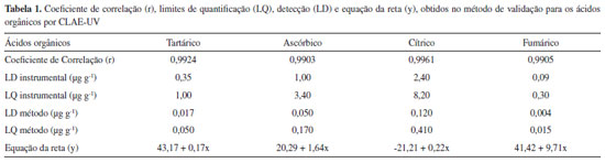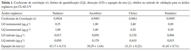 Inicialmente testaram-se os parâmetros cromatográficos resultantes dos estudos realizados previamente.2,13 Entretanto, o sistema de eluição que permitiu a melhor resolução dos quatro ácidos testados foi: 5:95 (v/v) de metanol-água (acidificada com ácido perclórico, até pH 2,1) com uma vazão de 1 mL min-1. A coluna de separação utilizada aliada à composição e vazão da fase móvel proporcionou uma boa separação cromatográfica, que permitiu detectar nitidamente os analitos em 8 min de corrida. Para a construção da curva analítica foi utilizada uma padronização externa a partir de sete níveis de concentração das soluções padrão dos ácidos. As faixas de linearidade apresentadas foram: 10 a 250 mg L-1 para os ácidos tartárico e ascórbico, 20 a 500 mg L-1 para o ácido cítrico e de 2 a 50 mg L-1 para o ácido fumárico. Os respectivos padrões foram preparados no momento da injeção e injetados em triplicata. A linearidade foi avaliada interdias e estimada pela análise de regressão linear através do método mínimo dos quadrados. Conforme apresentado na Tabela 1, as faixas de linearidade, obtidas individualmente para cada ácido, apresentaram coeficientes de correlação acima de 0,99, o que demonstra a validade do método.