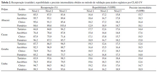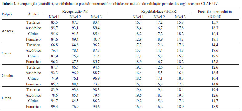 Os valores dos limites de detecção (LD) e de quantificação (LQ) apresentados na Tabela 1 foram obtidos pela determinação dos analitos a partir de diluições sucessivas e decrescentes da solução padrão de menor concentração. O limite de detecção instrumental foi definido como três vezes o ruído da linha de base e o limite de quantificação instrumental foi considerado quando a relação sinal ruído apresentar-se superior a 10:1. Os valores de LD e LQ do método foram estimados pela divisão dos valores dos LD e LQ instrumental pelo fator de diluição da amostra durante o seu preparo (20 vezes). Esses resultados demonstram que o método é adequado para detectar e quantificar os níveis de concentração dos ácidos tartárico, ascórbico, cítrico e fumárico presentes nas amostras de polpa de fruta. A exatidão foi determinada em função da recuperação do analito pela sua quantificação na matriz em estudo através do emprego do padrão analítico. As amostras foram fortificadas em três níveis de concentração. No nível 1, as amostras foram fortificadas com 60, 50, 180 e 10 mg L-1 dos ácidos tartárico, ascórbico, cítrico e fumárico, respectivamente. No nível 2 as concentrações adicionadas foram de 140, 130, 380 e 26 mg L-1 dos ácidos tartárico, ascórbico, cítrico e fumárico, respectivamente. Finalmente, no nível 3 as concentrações adicionadas nas amostras foram de 220, 210, 580 e 42 mg L-1 dos ácidos tartárico, ascórbico, cítrico e fumárico, respectivamente. Para obter o valor da porcentagem do analito recuperado calculou-se a relação entre a concentração média determinada previamente e a concentração teórica correspondente após a adição do analito, multiplicada por 100.9-17 Os valores obtidos encontram-se na Tabela 2, e demonstram resultados aceitáveis para recuperação em matrizes complexas.