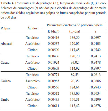 Cinética de degradação das polpas armazenadas Os parâmetros cinéticos de degradação dos ácidos orgânicos nas polpas congeladas (taxa de degradação e meia-vida) foram determinados conforme procedimento apresentado na literatura.23 Os valores das concentrações remanescentes dos ácidos tartárico, ascórbico e cítrico, em cada um dos quatro tipos de polpa de fruta, foram ajustados ao modelo de cinética de primeira ordem em função do tempo de estocagem. Os resultados da Tabela 4 revelam que as maiores taxas de degradação foram observadas para o ácido ascórbico nas polpas de cacau e goiaba, cujos valores das constantes de degradação foram de 0,01924 e 0,00985 dias-1. As magnitudes das constantes de velocidade demonstram a sensibilidade do ácido ascórbico na temperatura de armazenamento para as polpas dessas duas frutas. Já nas polpas de umbu o ácido ascórbico apresentou índices de estabilidades muito bons, quando comparado com os demais ácidos, resultando em um dos melhores tempos de meia vida, 159,31 dias. Tal valor de meia vida contrasta com os valores de 36,02 e 70,36 dias, observados para as polpas de cacau e goiaba, respectivamente.