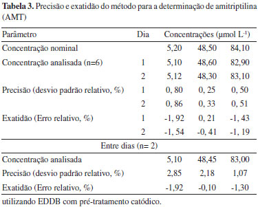 A precisão intra e inter-dia foi avaliada por meio de repetições de análises (n = 6), em solução de AMT de três diferentes concentrações, cujos valores encontram-se dentro da faixa linear da curva analítica, abrangendo valores baixos (5,2 µmol L-1), valores médios (48,5 µmol L-1) e valores altos (84,1 µmol L-1). A Tabela 3 apresenta os resultados obtidos da precisão intra-dia e inter-dia para todas essas concentrações. Verifica-se que o desvio padrão relativo para as medidas intra-dia variou de 0,25 até 0,86%, enquanto a precisão inter-dia obteve uma variação de 1,07 até 2,85%.