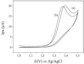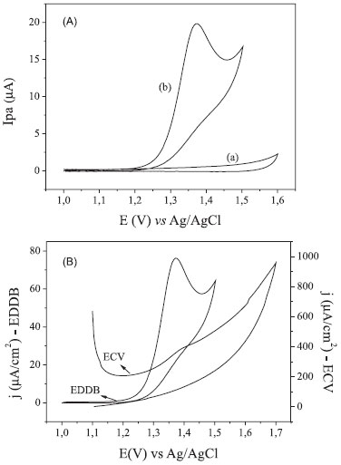 ![]() Figura 2. (A) Voltamogramas cíclicos obtidos empregando EDDB pré-tratado catodicamente: (a) H2SO40,1 mol L-1e (b) AMT 0,222 mmol L-1, velocidade de varredura 50 mV s-1. (B) Voltamogramas cíclicos empregando EDDB pré-tratado catodicamente e ECV: AMT 0,222 mmol L-1, velocidade de varredura 50 mV s-1