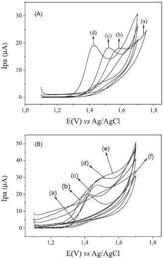 ![]() Figura 5. Voltamogramas cíclicos obtidos empregando EDDB pré-tratado catodicamente em solução de AMT 0,222 mmol L-1 (A) em diferentes concentrações de ácido sulfúrico: (a) 0,0001 mol L-1, (b) 0,001 mol L-1, (c) 0,01 mol L-1, (d) 0,1 mol L-1. (B) Influência do pH na determinação de AMT (a) H2SO4 0,1 mol L-1, (b) HNO30,1 mol L-1 (c)pH 4,0, (d) pH 5,0, (e) pH 6,0, (f) pH 7,0 em solução de tampão fosfato 0,1 mol L-1