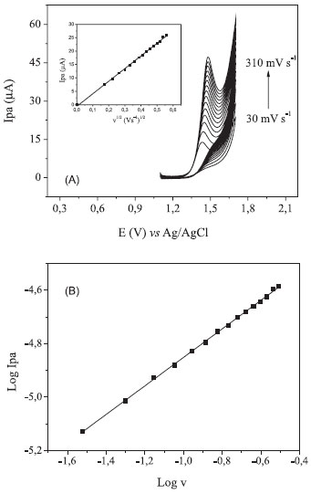 ![]() Figura 6. (A) Voltamogramas cíclicos obtidos empregando EDDB pré-tratado catodicamente em solução de H2SO4 0,1 mol L-1 contendo AMT 0,222 mmol L-1 em diferentes velocidades de varredura, de 30 a 310 mV s-1. Inserido: dependência da linear da corrente anódica com v1/2. (B) Dependência do log da corrente anódica com log n para AMT