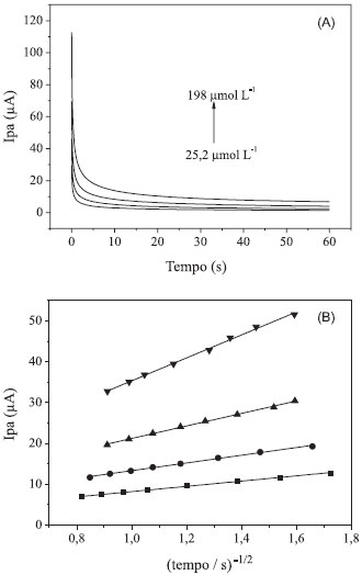 O coeficiente de difusão da AMT foi determinado experimentalmente, empregando-se a cronoamperometria, em um tempo de 60 s e potencial de 1,35 V, variando-se a concentração de AMT de 25,2 a 198 µmol L-1 (Figura 7A). Para esse cálculo foi utilizada a equação de Cottrell (Eq. 1)29