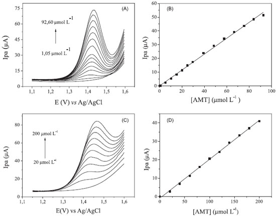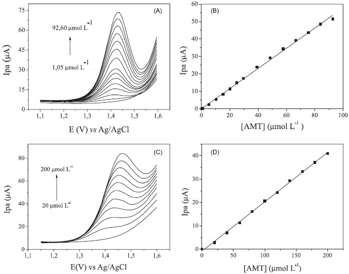 A Figura 8A apresenta os voltamogramas de pulso diferencial obtidos por sucessivas adições de AMT a solução de H2SO4 0,1 mol L-1. Observa-se linearidade na faixa de concentração de 1,05 a 92,60 µmol L-1, descrita pela equação Ipa = 0,57 c + 5,01 × 10-8 (r = 0,998), na qual Ipa é a corrente anódica em µmol L-1 e c a concentração de AMT (Figura 8B). Os valores calculados de limite de detecção (3 Sb/m) e limite de quantificação (10 Sb/m) foram 0,52 µmol L-1 e 1,75 µmol L-1 respectivamente, de acordo com as recomendações da IUPAC,33 na qual Sb é o desvio padrão de 10 leituras do branco e m é o coeficiente angular (sensibilidade) da curva de calibração. Os voltamogramas de onda quadrada também obtidos por adições sucessivas de AMT em H2SO4 0,1 mol L-1 são mostrados na Figura 8C. Para esta técnica, a faixa linear foi de 20 a 200 µmol L-1 com equação Ipa = 0,21 c - 8,85 × 10-7 (r = 0,998), como mostra a Figura 8D.