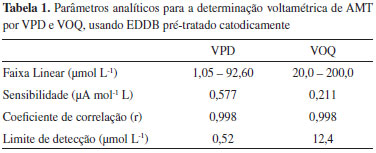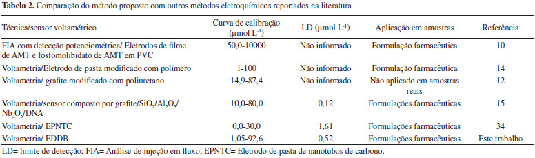 Na Tabela 2 estão reunidos alguns parâmetros analíticos obtidos a partir de métodos eletroanalíticos desenvolvidos para determinação de AMT. Em comparação com os referenciados, o método proposto apresenta satisfatório limite de detecção e simplicidade por não requerer modificação do eletrodo.
