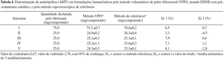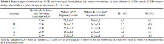Os excipientes usualmente presentes nas formulações farmacêuticas (estereato de magnésio, fosfato de cálcio, dióxido de silício, talco, dióxido de titânio e lactose monoidratada) contendo como princípio ativo a AMT foram avaliados como possíveis interferentes. Nenhum dos excipientes avaliados apresentou eletroatividade no EDDB na janela de potencial de trabalho, mesmo em concentrações 3 vezes maiores que a AMT, revelando a seletividade do método para aplicação em formulação farmacêutica contendo AMT. Aplicação do método em formulações farmacêuticas O método proposto foi aplicado em cinco formulações farmacêuticas comercias de diferentes procedências (I a V). A Tabela 4 apresenta os resultados obtidos para as diferentes amostras empregando o método proposto em comparação ao método espectrofotométrico descrito pela Farmacopéia Brasileira. Os resultados obtidos entre os métodos foram comparados por meio do teste t pareado ao nível de confiança de 95%. O valor t calculado (2,67) foi menor que o valor tabelado (2,77), mostrando não haver diferenças entre o método proposto e o método de referência, o que confirma a exatidão da aplicação do método em formulações farmacêuticas visando à determinação de AMT.