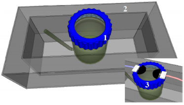 ![]() Figura 2. Sistema utilizado nos experimentos de liberação e permeação, com célula de difusão (1), em banho (2) a 37 ºC; no detalhe (3) aplicação de corrente por meio de eletrodos de carbono (iontoforese)