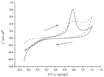 ![]() Figura 3. Voltamogramas cíclicos do gel de hidroxietilcelulose (linha tracejada), e este acrescido de α-tocoferol 1% (linha contínua), v = 10 mV/s