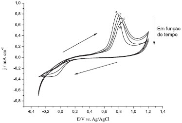 ![]() Figura 4. Voltametria cíclica de eletrodo de platina em sistema contendo gel de hidroxietilcelulose acrescido de α-tocoferol 1% em massa nos diferentes tempos estudados: a: 0 min, b: 2 min, c: 6 min e d: 10 min, v = 10 mV/s