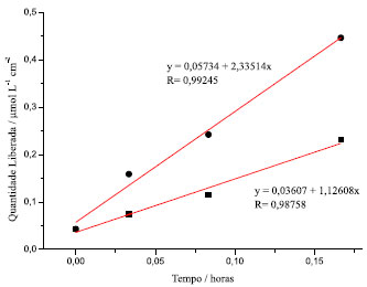 ![]() Figura 5. Quantidade liberada de α-tocoferol em função do tempo (horas) em sistemas de difusão vertical contendo gel de hidroxietilcelulose/α-tocoferol controle (■) e associado à iontoforese (●)