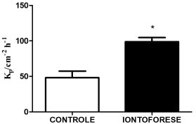 ![]() Figura 6. Coeficiente de permeabilidade do α-tocoferol sobre a membrana de acetato de celulose em sistemas controle e com aplicação de iontoforese