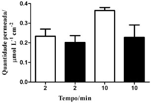 ![]() Figura 7. Quantidade permeada do α-tocoferol sem (■) e com (□) aplicação de iontoforese, nos tempos 2 e 10 min