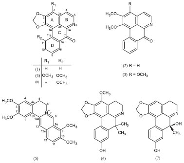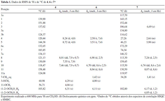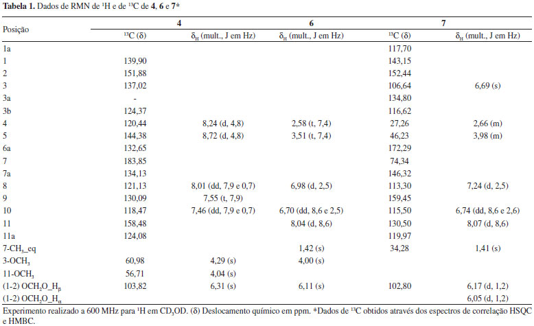 Liriodenina (1): IV. νmáx (KBr, cm-1): 2922, 2852, 1654, 1596, 1577, 1485, 1470, 1443, 1422, 1384, 1311, 1262, 1228, 1207, 1051, 1017, 964, 911, 872, 779, 752, 725, 690, 609 e 570 cm-1. RMN 1H (600 MHz, CD3OD) δ: 6,49 (H-1/2, s, OCH2O em C-1/C-2), 7,44 (H-3, s), 8,04 (H-4, d, 5,2), 8,75 (H-5, d, 5,2), 8,48 (H-8, dd, 7,8 e 1,5), 7,64 (H-9, ddd, 7,8, 7,4 e 1,1), 7,88 (H-10, ddd, 8,3, 7,4 e 1,5) e 8,78 (H-11, dd, 8,3 e 1,1); EI-MS m/z 276 ([M + H]+), consistente com a fórmula molecular C17H9NO3. Dados de acordo com a literatura.5 Lisicamina (2): IV. νmáx (KBr, cm-1): 2924, 2850, 1653, 1610, 1595, 1567, 1482, 1463, 1413, 1307, 1262, 1246, 1204, 1139, 1045, 1014 e 748 cm-1. RMN 1H (600 MHz, CD3OD) δ: 4,07 (H-1, s, OCH3), 4,14 (H-2, s, OCH3), 7,56 (H-3, s), 8,02 (H-4, d, 5,3), 8,74 (H-5, d, 5,3), 8,45 (H-8, dd, 8,1 e 1,3), 7,61 (H-9, ddd, 8,1, 7,1 e 1,1), 7,83 (H-10, ddd, 8,4, 7,1 e 1,3) e 9,21 (H-11, dd, 8,4 e 1,1); EI-MS m/z 292 ([M + H]+) consistente com a fórmula molecular C18H13NO3. Dados de acordo com a literatura.22 O-Metilmoschatolina (3): IV. νmáx (KBr, cm-1): 2944, 2856, 1713, 1665, 1595, 1579, 1547, 1478, 1394, 1332, 1312, 1257, 1205, 1159, 1118, 1095, 1045, 1008, 974, 942, 854, 760 e 689 cm-1. RMN 1H (600 MHz, CD3OD) δ:4,126 (H-1, s, OCH3), 4,127 (H-2, s, OCH3), 4,23 (H-3, s, OCH3), 8,38 (H-4, d, 4,5), 8,87 (H-5, d, 4,4), 8,48 (H-8, dd, 7,9 e 1,4), 7,59 (H-9, ddd, 7,9, 7,2 e 1,1), 7,84 (H-10, ddd, 8,5, 7,2 e 1,5) e 9,20 (H-11, d, 8,5); EI-MS m/z 322 ([M + H]+) consistente com a fórmula molecular C19H15NO4. Dados de acordo com a literatura.23 3-Metoxioxoputerina (4): RMN 1H (600 MHz, CD3OD), Ver Tabela 1. Dados de acordo com a literatura.15 EI-MS m/z 336 ([M + H]+) consistente com a fórmula molecular C19H13NO5. Palmatina (5): IV. νmáx (KBr, cm-1): 3426, 2944, 2851, 1635, 1606, 1512, 1458, 1362, 1273, 1240, 1217, 1138, 1112, 1067, 1018, 969 e 811 cm-1. RMN 1H (600 MHz, CD3OD) δ:4,00 (H-2, s, OCH3), 3,95 (H-3, s, OCH3), 4,21 (H-9, s, OCH3), 4,11 (H-10, s, OCH3), 7,67 (H-1, s), 7,06 (H-4, s), 3,23 (H-5, t, 4,3), 4,94 (H-6, t, 4,3), 9,76 (H-8, s), 8,12 (H-11, d, 9,1), 8,02 (H-12, d, 9,1) e 8,80 (H-13, s); EI-MS m/z 352 ([M + H]+) consistente com a fórmula molecular C21H22NO4. Dados de acordo com a literatura.24 3-Metoxiguadiscidina (6): IV. νmáx (KBr, cm-1): 3432, 2996, 2946, 2854, 1637, 1603, 1508, 1457, 1423, 1387, 1332, 1300, 1253, 1209, 1062, 987, 954 e 820 cm-1. RMN 1H (600 MHz, CD3OD). Ver Tabela 1. Dados de acordo com a literatura.22 EI-MS m/z 338 ([M + H]+), correspondendo à fórmula molecular C20H19NO4; m/z: 323 (291), 308, 278, 250 e 232. Guattescidina (7): [α]D20 13.7º (c 1.0, MeOH). RMN 1H (600 MHz, CD3OD). Ver Tabela 1. Dados de acordo com a literatura.18 ([M + H]+) em m/z 310, consistente com a fórmula molecular C18H15NO4. Oxoputerina (8): RMN 1H (600 MHz, CD3OD) δ: 6,26 (H-1/2, s, OCH2O em C-1/C-2), 7,15 (H-3, s), 4,02 (H-11, s, OCH3), 7,73 (H-4, d, 5,1), 8,83 (H-5, d, 5,1), 8,17 (H-8, dd, 7,8 e 1,1), 7,55 (H-9, dd, 8,2 e 7,8) e 7,30 (H-10, dd, 8,2 e 1,1); EI-MS m/z 306 ([M + H]+) correspondendo à fórmula molecular C19H13NO5. Dados de acordo com a literatura.15 As estruturas de 1-8 estão representadas na Figura 1.