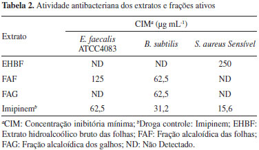 Atividade antibacteriana Os extratos e frações avaliados foram inativos frente às bactérias Gram-negativas e ativos contra três cepas de bactérias Gram-positivas como mostra a Tabela 2. A moderada atividade frente à bactéria patogênica Enterococcus faecalis (ATCC 4083) (CIM = 125 µg mL-1) é um resultado promissor, tendo em vista a resistência dessas bactérias aos antibióticos do mercado.25,26 Essa atividade é atribuída à presença de alcaloides isoquinolínicos, cuja eficiência é reconhecida frente a cepas Gram+.27 Resultado similar foi obtido para a fração alcaloídica de Guatteria hispida, destacando-se o alcaloide liriodenina por ser mais ativo em relação ao controle positivo cloranfenicol contra a Gram positiva Staphylococcus epidermidis.5 A resistência de bactérias Gram-negativas, Escherichia coli e Pseudomonas aeruginosa, a frações alcaloídicas e a alguns alcaloides como O-metilmoschatolina, lisicamina, isomoschatolina, nornuciferina, isocoreximina e liriodenina isolados de espécies G. híspida e G. blepharophylla já foi relatada na literatura.5,28,29