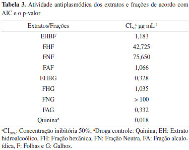 Atividade antiplasmódica in vitro Os resultados dos testes in vitro com extratos e frações contra Plasmodium falciparum FCR3 são apresentados na Tabela 3. Os extratos EHBF e EHBG apresentaram elevada atividade antiplasmódica exibindo CI50 de 1,183 µg mL-1 e 0,3277 µg mL-1, respectivamente. Observou-se que as frações alcaloídicas FAF (CI50 = 1,183 µg mL-1) e FAG (CI50 = 0,3277 µg mL-1) e FHG (CI50 de 1,035 µg mL-1) foram muito ativas, sendo que a constituição química da última não foi investigada neste trabalho. A significativa atividade de FAF e FAG pode ser atribuída aos constituintes alcaloídicos liriodenina e lisicamina, com atividades já relatadas na literatura.30,31 Observou-se, adicionalmente, em FAG, a presença do alcaloide comprovadamente ativo palmatina,31 e dos alcaloides fenólicos 3-metoxiguadiscidina e guattescidina, para os quais não há estudos de atividade antiplasmódica. Sener et al.32 sugerem que o grupo metilenodioxi e o nitrogênio terciário não metilado contribuem para a alta atividade dos alcaloides. Wright et al.,33 avaliando a atividade antiplasmódica de alguns grupos de alcaloides, relataram que a presença do nitrogênio quaternário aumenta a atividade dos protoberberínicos. No grupo dos aporfínicos, os autores sugerem que a função amina secundária ou um substituinte fenólico aumenta a atividade antiplasmódica in vitro em relação às aminas terciárias e substituintes metoxilados, os quais foram cerca de sete vezes menos ativos. As observações acima podem explicar a maior atividade de FAG, portadora do alcaloide protoberberinínico 5 e dos alcaloides 6 e 7, ambos contendo uma hidroxila fenólica no C-9. Os resultados das investigações antiplasmódicas in vitro são promissoras, como já descritos na literatura.7,34-37 Pesquisas intensivas in vivo devem ser realizadas, uma vez que há relatos de que protoberberínicos como a palmatina e outros alcaloides não foram ativos in vivo contra o Plasmodium berghei.38