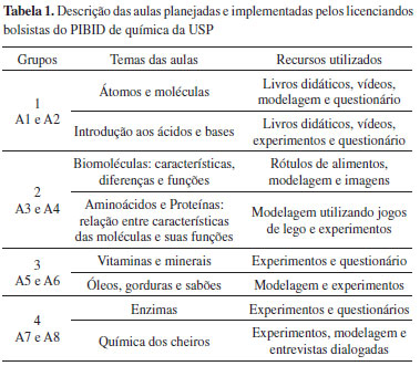 PARTE EXPERIMENTAL O projeto PIBID de química da Universidade de São Paulo (campus São Paulo) iniciou suas atividades no segundo semestre do ano de 2012. O projeto foi desenvolvido por uma parceria entre a Universidade de São Paulo (USP) e a Escola de Aplicação da Faculdade de Educação da USP e envolveu 14 bolsistas licenciandos em química. As atividades desenvolvidas durante todo o período de execução do projeto (aproximadamente 1 ano e meio) visavam a formação do professor na prática docente e o desenvolvimento de metodologias de ensino que utilizem visualizações para auxiliar na aprendizagem dos alunos. Neste projeto, os licenciandos em química obtiveram formação teórica em temas relacionados a visualização e o ensino de química, bem como em relação à prática docente. Os encontros entre os bolsistas, coordenador do projeto e os professores supervisores que acompanhavam as atividades dos alunos na escola, ocorreram semanalmente. Durante estes encontros, além da formação teórica, os bolsistas tiveram momentos de planejamento de aulas e atividades de ensino de química a serem desenvolvidas na escola. Os licenciandos participantes do projeto cursavam diferentes etapas do curso de licenciatura em química e traziam para o grupo diferentes experiências que eram compartilhadas durante as reuniões. As reuniões de planejamentos de aula e sequências didáticas eram realizadas em grupos. Dois grupos foram formados para as atividades na escola, sendo que um grupo aplicava suas sequências didáticas em uma turma do primeiro ano do ensino médio, sob a supervisão da professora de química, e outro grupo desenvolvia atividades sobre química para alunos do nono ano do ensino fundamental, estes momentos de atividades com os alunos do ensino fundamental ocorriam em períodos de contra turno sob a supervisão e auxílio do professor de ciências do ensino fundamental. Dentro de cada grupo os licenciandos eram divididos em duplas de trabalho que escolhiam o tema a ser trabalhado e desenvolviam um planejamento inicial a ser discutido e aprimorado durante as reuniões de discussão em grupo. Este trabalho apresenta resultados coletados durante projeto PIBID de química da USP desenvolvido no segundo semestre de 2013. Durante o semestre os licenciandos foram acompanhados no processo de discussão e preparação de planos de aula durante as reuniões semanais com os grupos, bem como no desenvolvimento das atividades na escola. Em cada encontro foram tomadas notas e as discussões foram gravadas com o auxílio de um gravador de áudio. Durante a aplicação das atividades na escola, observou-se a atuação dos licenciandos em sala de aula e tomaram-se notas. Além dos pesquisadores, outras duplas também acompanhavam os licenciandos no desenvolvimento de atividades e os ajudavam quando necessário. Os pesquisadores também tiveram acesso aos planos de aula e relatórios desenvolvidos pelos bolsistas durante os semestres. A partir dos materiais coletados e das observações foram desenvolvidas entrevistas que foram realizadas com cada licenciando individualmente e versava sobre o desenvolvimento do grupo, das duplas e do bolsista ao longo do projeto, bem como as contribuições do grupo para este desenvolvimento. Também foi aplicado um questionário para todos os bolsistas com questões relacionadas à aprendizagem deles durante o projeto e às contribuições do grupo para esta aprendizagem. Para este trabalho foram escolhidas as análises dos resultados obtidos no grupo que trabalhou com alunos de ciências do ensino fundamental. O grupo era composto por oito licenciandos que formaram quatro duplas. Durante o semestre o grupo ministrou minicursos com o tema bioquímica aos alunos do ensino fundamental. Nestes minicursos foram abordados conceitos de moléculas e macromoléculas, bem como apresentadas as características e propriedades químicas de compostos bioquímicos como proteínas, enzimas, lipídios, vitaminas e minerais. O grupo trabalhou em conjunto para que cada dupla desenvolvesse seu tema relacionando com os temas já abordados pelas outras duplas. Cada dupla planejou e aplicou dois minicursos, dando um total de oito minicursos aplicados durante o semestre. Na Tabela 1 estão sintetizados os temas trabalhados por cada dupla nos minicursos de bioquímica, bem como os recursos utilizados para o desenvolvimento do tema com os alunos.