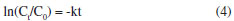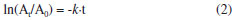 where At correspond to the absorbance at 400 nm as a function of the time t; A0 the initial absorbance, and k the rate constant. The pseudo-first-order rate law can be expressed as:
