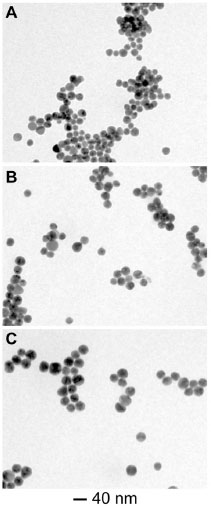 ![]() Figure 1. TEM images of Au NPs seeds (A) and Au NPs after the first (B) and second (C) deposition steps. In (A-C), the Au NPs diameters corresponded to 15 ± 2.2, 26 ± 2.4, and 34 ± 3.0 nm, respectively