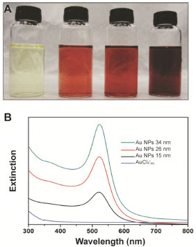 ![]() Figure 2. (A) Digital photographs of the AuCl4-(aq) solution and aqueous suspensions containing Au NPs 15 ± 2.2, 26 ± 2.4, and 34 ± 3.0 nm in diameter (shown from left to right, respectively). (B) UV-VIS extinction spectra recorded for the AuCl4-(aq) solution and aqueous suspensions containing Au NPs 15 ± 2.2, 26 ± 2.4, and 34 ± 3.0 nm in diameter (blue, black, red, and green traces, respectively)