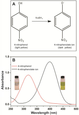 ![]() Figure 3. (A) Scheme for the formation of 4-nitrophenolate ions upon the addition of an excess of sodium borohydride to a 4-nitrophenol aqueous solution, leading to a change in color from light to dark yellow. (B) UV-VIS spectra and digital micrographs obtained from aqueous solutions of 4-nitrophenol (red trace) and 4-nitrophenolate ions (black trace)