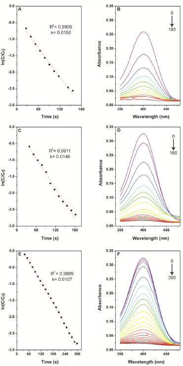 where e is the molar absorptivity of the substance and b the optical path, Equation 2 is then obtained by replacing 5 into 4. Figure 4 shows the plots of ln(Ct/C0) and the UV-VIS absorption spectra as a function of time for the Au NPs that were 15 ± 2.2 (Figure 4A and B), 26 ± 2.4 (Figure 4C and D), and 34 ± 3.0 nm in diameter (Figure 4E and F). As all catalytic investigations were performed employing the same concentration of Au, and the differences in catalytic activity can be associated with the variations in size and thus available surface area for catalysis. In all cases, the decrease in the intensity of the band at 400 nm with time was observed due to the consumption of 4-nitrophenolate ions. It can be detected that the disappearance of the band at 400 nm became slower as the Au NPs size increased, in agreement with the decrease in catalytic activity with size. The calculated rate constants (k) decreased as the Au NPs size increased, and corresponded to 0.0150 ± 0.0008, 0.0146 ± 0.0012, and 0.0107 ± 0.0010 s-1 for Au NPs 15 ± 2.2, 26 ± 2.4, and 34 ± 3.0 nm in diameter, respectively. Interestingly, the decrease in the catalytic activity as the size increased from 15 to 26 nm was less pronounced as compared to the decrease in catalytic activity as the size increased from 26 to 34 nm. It is noteworthy that no changes in the 400 nm band intensity were observed under similar conditions in the absence of Au NPs, indicating that the presence of the catalyst is essential for the reaction to take place in this timeframe (no reaction occurs in the absence of catalyst under similar conditions).