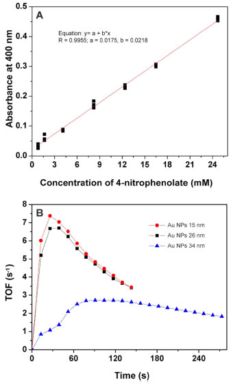 ![]() Figure 5. (A) UV-VIS calibration curve for 4-nitrophenolate concentration and (B) calculated TOFs as a function of time for Au NPs 15 ± 2, 26 ± 2, and 34 ± 3 nm in diameter (red, black, and blue traces, respectively)