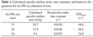 Another parameter that can be employed to describe the catalytic activity of Au NPs is the TOF (turnover frequency). The TOF can be defined as the number of completed catalytic cycles per atom of the catalyst as a function of time.31 Here, the TOF was calculated according to the equation 2: