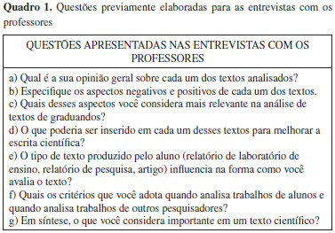 PERCURSO METODOLÓGICO Participaram da pesquisa quatro professores de universidades públicas paulistas. Dois deles são professores pesquisadores da área de química inorgânica, sendo um com 34 anos (PQI-1) e o outro com nove anos (PQI-2) de experiência docente no ensino superior. Os outros dois professores são pesquisadores da área de química orgânica, um deles com seis anos (PQO-1) e o outro com 31 anos (PQO-2) de experiência docente. Cada um dos professores da área de química inorgânica recebeu dois relatórios de laboratórios produzidos por estudantes do quinto semestre de um curso de Bacharelado em Química de uma universidade pública paulista. Tais relatórios foram elaborados com base nas atividades desenvolvidas em uma disciplina de caráter experimental que aborda a síntese e caracterização de compostos de coordenação. Os relatórios entregues aos professores continham os resultados e discussão de todos os compostos sintetizados pelos alunos durante o semestre. Para a produção dos relatórios, estes receberam instruções básicas sobre a organização geral de relatório de laboratório.13 Cada um dos professores da área de química orgânica recebeu dois textos no formato de artigo científico, os quais foram produzidos por estudantes do terceiro semestre de um curso de Bacharelado em Química de uma universidade pública paulista no contexto das atividades desenvolvidas em uma disciplina de caráter teórico da área de química orgânica. Para elaboração dos textos os estudantes receberam dados experimentais coletados em laboratório de ensino de química orgânica, os quais foram fornecidos pelo professor da disciplina. Cabe destacar que são oferecidas a tais estudantes nos semestres anteriores duas disciplinas nas quais são discutidos, dentre outros assuntos, aspectos relacionados à organização de diversos tipos de textos científicos. Os textos dos estudantes foram entregues aos professores de cada área sem a identificação da disciplina e da instituição na qual foram desenvolvidos e sem a identificação da autoria. Solicitamos aos professores que avaliassem a qualidade da escrita científica dos textos, informando-lhes apenas que estes haviam sido produzidos por estudantes de graduação em química. Não especificamos quais aspectos do texto deveriam considerar na análise. Em posterior data e horário, realizamos entrevistas individuais semiestruturadas gravadas em áudio e adotamos em todas elas um mesmo roteiro previamente elaborado (Quadro 1).