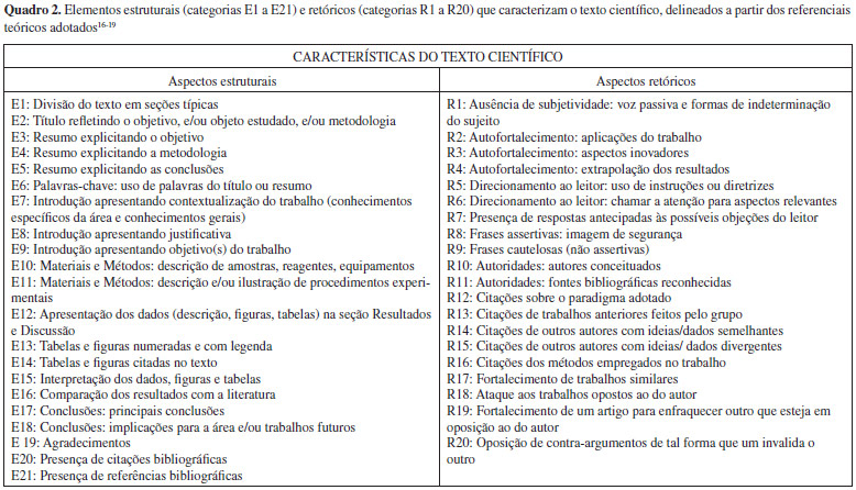REFERENCIAIS TEÓRICOS O delineamento das características da linguagem científica - as quais subsidiaram a análise dos aspectos considerados relevantes pelos professores na avaliação dos textos científicos - foi pautado em trabalhos que nos permitiram compreender o discurso científico, não apenas considerando seus constituintes estruturais e padrões exigidos explicitamente pela comunidade científica, mas também as características retóricas desse discurso. As características retóricas - descritas com mais detalhes em trabalho anterior15 - foram delineadas com base nas considerações apresentadas nos estudos de Latour,16 Coracini17 e Campanario.18 Latour16 destaca que, ao contrário da "ciência acabada", na qual as produções científicas não representam mais problemas a serem discutidos, o processo de construção da ciência é repleto de incertezas e controvérsias. É nesse contexto de controvérsias que os cientistas saem à procura de recursos e, então, começam a lançar mão de textos, arquivos, documentos, artigos e uma série de estratégias linguísticas para forçar o outro a dar credibilidade às suas afirmações. Sob essa perspectiva, o autor descreve várias estratégias retóricas presentes nos artigos científicos. As questões relacionadas à subjetividade do discurso científico são descritas e discutidas por Coracini,17 a qual, por meio da análise de artigos científicos primários e entrevistas com pesquisadores em exercício, aponta diversos elementos e estratégias linguísticas presentes nos artigos científicos, evidenciando que "o discurso científico, a despeito das aparências, é altamente subjetivo e, portanto, constitui em um fazer persuasivo" (p.20). Campanario18 destaca que o artigo científico pode revelar diversos aspectos da atividade dos pesquisadores e, dessa forma, ser uma ferramenta útil para proporcionar uma visão mais real da dinâmica da ciência. Nesse contexto, o autor analisou a estrutura e as estratégias retóricas mais comuns em textos científicos. No que diz respeito aos aspectos estruturais, especialmente aqueles relacionados à organização e conteúdo apresentados nas seções típicas dos textos científicos, adotamos as considerações encontradas em trabalho de nossa autoria (livro Comunicação e Linguagem Científica: Guia para Estudante de Química),19 o qual é direcionado a estudantes de graduação e contém informações gerais sobre a organização dos principais tipos de documentos científicos publicados na área de química, características gerais de suas seções típicas, tipos de fontes de informação na área etc. Com base nos referidos estudos, identificamos as principais características da linguagem científica, as quais foram organizadas em categorias de elementos estruturais e de elementos retóricos (Quadro 2).