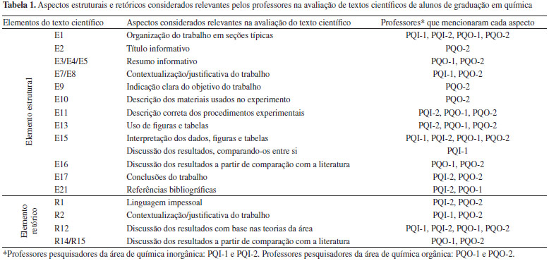 RESULTADOS E DISCUSSÃO Tendo em vista que objetivamos reconhecer quais aspectos da linguagem científica os professores consideram relevantes na avaliação de textos produzidos pelos graduandos, procuramos identificá-los nas entrevistas e correlacioná-los com os elementos estruturais e retóricos da linguagem científica, definidos a partir dos referenciais teóricos. A Tabela 1 sintetiza os resultados desse exercício por nós empreendido.