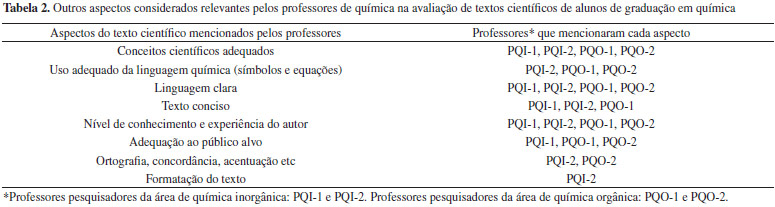 Alguns professores observaram também o uso de referências bibliográficas no texto (E21), embora não tenham detalhado com quais critérios as analisam. Um deles admitiu não ter verificado no texto analisado "se estaria correto ou não a forma de escrever as referências" (PQO-2). Cabe lembrar que, no que se refere ao uso de referências bibliográficas, os professores concentraram suas análises e comentários apenas sobre os textos dos estudantes. Possivelmente, se estivessem avaliando textos de pesquisadores tal elemento seria observado com mais rigor, uma vez que o uso de citações e referências bibliográficas é uma características do texto científico muito empregada e valorizada pela comunidade científica.17,18 Conforme discutiremos mais adiante, os professores, de fato, admitem analisar com rigor diferenciado os textos de estudantes e de pesquisadores. Na análise geral dos elementos estruturais considerados relevantes pelos professores na avaliação dos textos científicos verificamos que poucos elementos dessa natureza não foram discutidos durante as entrevistas. Alguns deles, como as palavras-chave (E6) e Agradecimentos (E19), por exemplo, representam elementos estruturais geralmente presentes apenas em trabalhos oriundos de pesquisa científica. Por esse motivo os professores não os consideraram na avaliação dos textos dos estudantes. Alguns elementos como a apresentação correta das citações bibliográficas (E20), e das tabelas e figuras, bem como sua citação no corpo do texto (E14), não foram observados dentre os critérios mencionados pelos professores. É importante levar em conta que, em geral, esses elementos são considerados apenas para detalhes de padronização da escrita científica e, talvez por esse motivo, não foram por eles valorizados. Os professores, aparentemente, não refletiram sobre como o emprego correto das tabelas e figuras - uso de legendas explicativas, citação no corpo do texto - é útil no sentido de guiar o leitor na análise e interpretação dos dados. Quanto aos elementos retóricos verificamos que bem poucos foram considerados pelos professores na avaliação dos textos científicos. Conforme mencionamos anteriormente, ao discutirem sobre a relevância da discussão dos resultados, tanto com base nas teorias da área quanto a partir da comparação com a literatura, os professores colocaram em foco elementos como o uso de citações sobre conhecimentos específicos (R12) e de citações de outros autores com ideias/dados semelhantes (R14). Conforme Coracini,17 esses são alguns dos recursos retóricos mais reconhecidos pela própria comunidade científica, por isso mesmo, requeridos durante o processo de avaliação do texto científico. Além disso, nos comentários sobre a importância da contextualização e justificativa observamos claramente a ênfase dada à estratégia de autofortalecimento por meio da indicação das aplicações do trabalho (R2). Tal estratégia também é relativamente comum nos textos dos pesquisadores,18 o que possivelmente os leva a considerá-la na avaliação de textos científicos. Além desses elementos, a impessoalidade da linguagem científica - elemento retórico (R1) bastante presente em textos científicos - foi mencionada por dois professores, embora com visões distintas. Um deles manifestou a preocupação em descrever para os estudantes o uso correto da linguagem impessoal na produção dos textos científicos. Já o outro professor considera até mais agradável a leitura de textos nos quais o autor se revela de maneira explícita, ressaltando: que isso [a subjetividade] não faz o texto ficar pior, por sinal acho que até melhor, mas às vezes o pesquisador parece que tem que ser uma pessoa sisuda, que não pode se permitir dar um toque pessoal ao texto. (PQO-2) Cabe destacar que esse professor reconheceu que ele mesmo também segue o "estilo burocrático" na produção de seus trabalhos, sobretudo porque não considera fácil redigir um texto científico de forma mais pessoal, sem perder a qualidade. Percebe-se que mesmo com visões diferenciadas, os dois professores adotam, seja na avaliação dos trabalhos e/ou na sua própria prática, o caráter objetivo do texto científico. Essa postura por parte dos sujeitos deve-se, ao menos em parte, ao fato de que muitos professores, conforme já mencionamos, "copiam os modelos que lhes foram passados quando eram alunos".10 Sendo a impessoalidade uma característica da linguagem científica largamente divulgada e empregada pela comunidade científica, os professores, ainda que valorizem formas mais subjetivas de comunicação entre os pares, não conseguem - ou não podem - mudar hábitos linguísticos tão enraizados em seu meio. A ausência de comentários sobre os demais elementos retóricos, como por exemplo, a indicação dos aspectos inovadores do trabalho (R3), o uso de estratégias de direcionamento ao leitor (R5 e R6) ou emprego de citações de trabalhos com dados divergentes (R15), pode ser atribuída ao fato desses elementos serem pouco frequentes em textos de estudantes.15 Além disso, embora os pesquisadores empreguem várias estratégias retóricas, conforme discutimos anteriormente, os professores (também pesquisadores da área de química), na maioria das vezes, não as utilizam como critérios de avaliação de textos científicos, possivelmente por não (re)conhecê-las como elementos que caracterizam a linguagem da ciência. Além dos elementos estruturais e retóricos da linguagem científica, descritos no Quadro 2, os professores também adotaram outros critérios na análise dos textos dos estudantes, os quais estão elencados na Tabela 2.