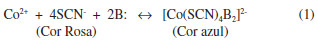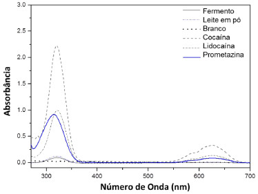 Em 2005 e 2007, Tsumura et al.12 e Morris28 também estudaram a especificidade do teste de Scott, onde resultados positivos também foram encontrados para amostras de heroína, 5-metoxi-N,N-diisopropiltriptamina e quetamina. Uma forma alternativa de aumentar a especificidade desse teste foi proposto por Haddoub et al.29 em 2011, onde ensaios colorimétricos eram realizados sob o spot obtido após uma análise de cromatografia de camada delgada na qual as amostras de cocaína, lidocaína, levamizol, procaína e fenacetina apresentavam diferentes fatores de retenção. Análises UV/VIS As análises por espectroscopia na região do UV/VIS foram realizadas para as amostras que mostraram resultados positivos (lidocaína e prometazina) e inconclusivos (leite em pó e fermento) usando o teste de Scott. Todas as soluções de complexos foram preparadas em acetato de etila devido a uma melhor solubilidade do sistema. A Figura 2 mostra os espectros de UV-VIS na região de 200-700 nm. Duas transições eletrônicas são detectadas com máximo de absorção na região de 320-330 e 640 nm. A primeira banda, correspondente à transição eletrônica π-π* do grupo C≡N do complexo de cobalto, apresenta uma maior absorção quando os ligantes cocaína, lidocaína e prometazina estão presentes. Um menor grau de absorção é observado para os sistemas contendo leite em pó e fermento. A segunda banda, 640 nm, é apenas observada para o sistema [Co(SCN)4L2]2-, onde L = prometazina, cocaína e lidocaína.30 Portanto, a técnica de UV-VIS pode ser útil para eliminar alguns resultados falso-positivos, neste caso, interferentes ao teste de Scott como o fermento e o leite em pó.