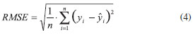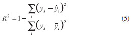 onde n é o número de amostras de calibração, yi o valor de concentração de referência e ŷi o valor de concentração estimado pelo modelo. O número ótimo de variáveis latentes do modelo é determinado pelo mínimo erro de validação cruzada (RMSECV). Outro importante parâmetro estatístico calculado é o coeficiente de determinação R2 dado por: