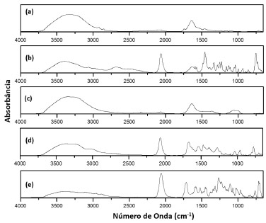 ![]() Figura 3. Espectros de infravermelho dos complexos [Co(SCN)4L2]2-, onde L = (a) leite em pó; (b) prometazina; (c) fermento; (d) lidocaína; e (e) cocaína